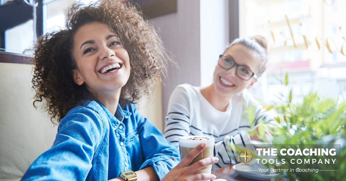 Image of Two women smiling and sharing a coffee, symbolising gratitude, connection, and supportive relationships in coaching. by @gpointstudio via Freepik